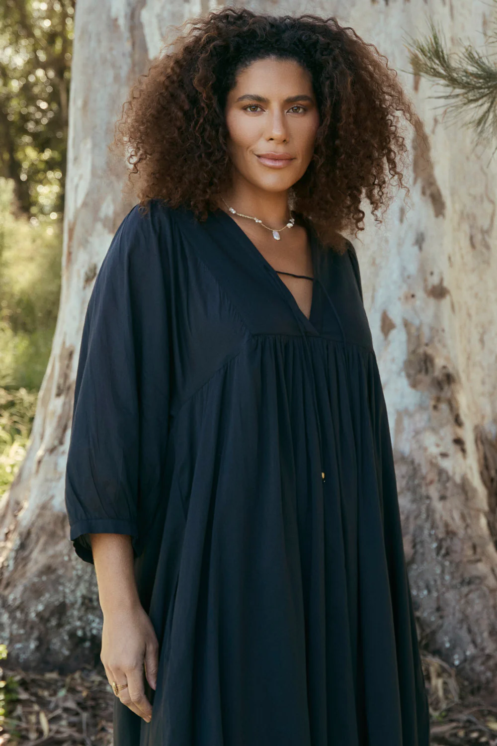 The Cairo Boho Dress in Black is a must-have for your wardrobe, featuring a plunge V-neckline with button hole tie, and ¾ length elasticated sleeves. Its gathered skirt and bodice yokes provide a flattering, comfortable silhouette for all-day wear.
