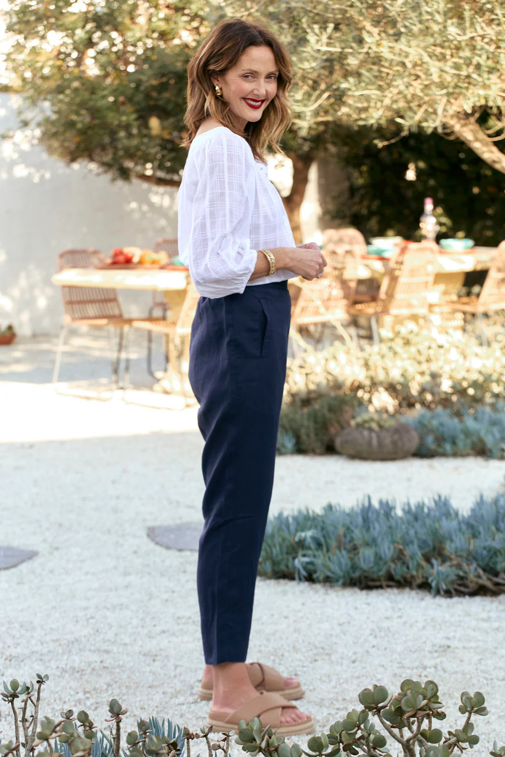 Designed in Brisbane, the Caprice Linen Pant in Navy features a high-waisted rise, flat front waistband, and elastic back for effortless comfort. Front welt pockets and a wide hem with optional cuffs create a modern, minimalist silhouette.