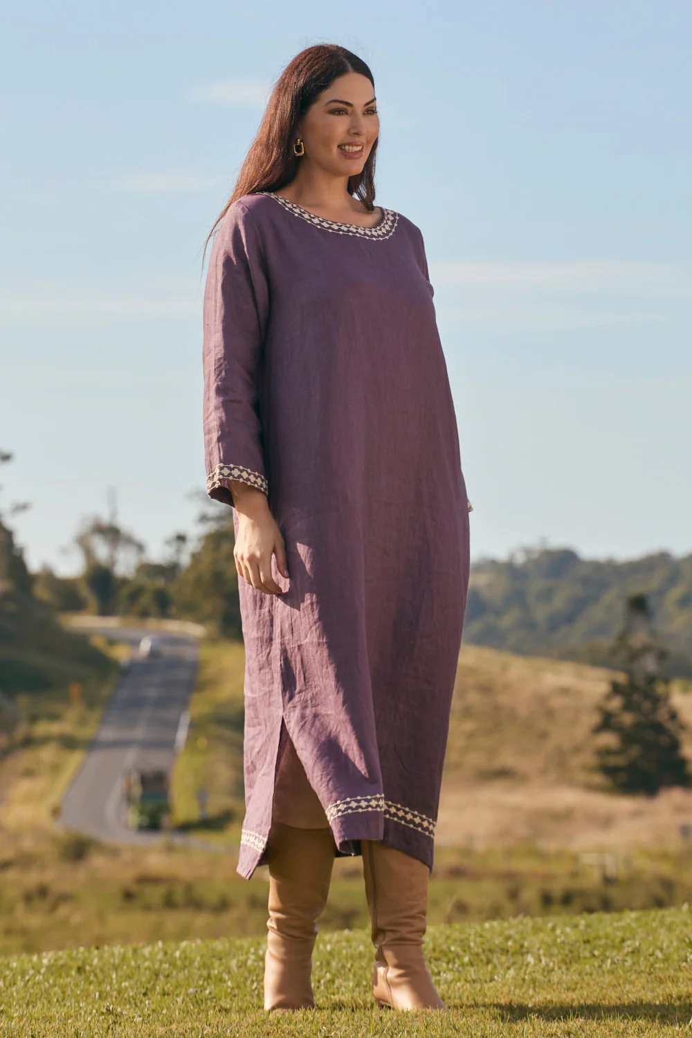 Elegant yet easy to wear, the Jarla Linen Dress in Merlot Dream features a wide boatneck, ¾ sleeves, and beautifully embroidered details. Made from soft, breathable linen, it’s perfect for stylish Australian days.
