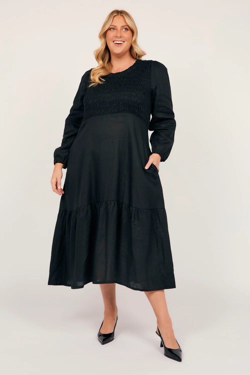 Minden Linen Long Sleeve Shirred Dress in Black