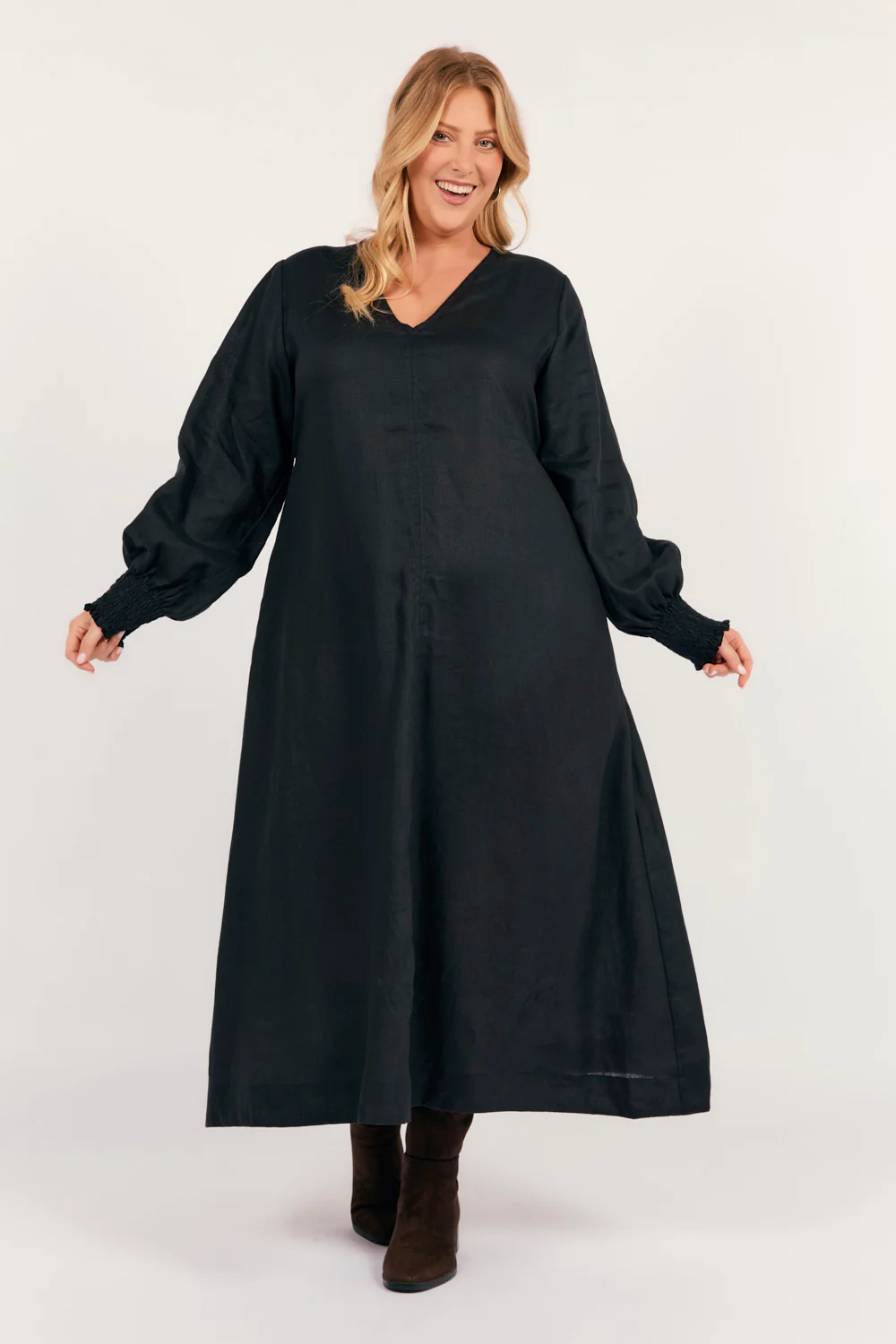 Effortless elegance meets everyday ease in the Tamara Long Sleeve Dress in Black. Crafted from 100% linen, this maxi swing dress offers a flattering and floaty silhouette, complete with a soft v-neckline and long sleeves.
